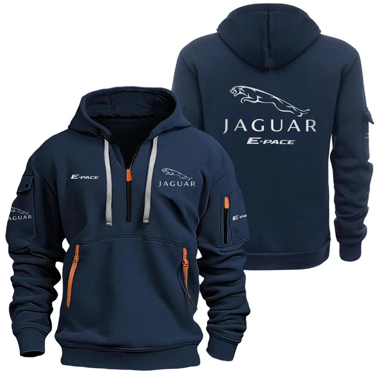 Elevate your wardrobe with our Jaguar E-Pace hoodie half zipper half zipper, meticulously crafted for both function and fashion. Featuring long sleeves for added warmth and coverage, this hoodie keeps you comfortable in cooler conditions. The hooded neckline adds a modern, trendy touch to the ensemble, making it a perfect choice for those who appreciate a contemporary look.
