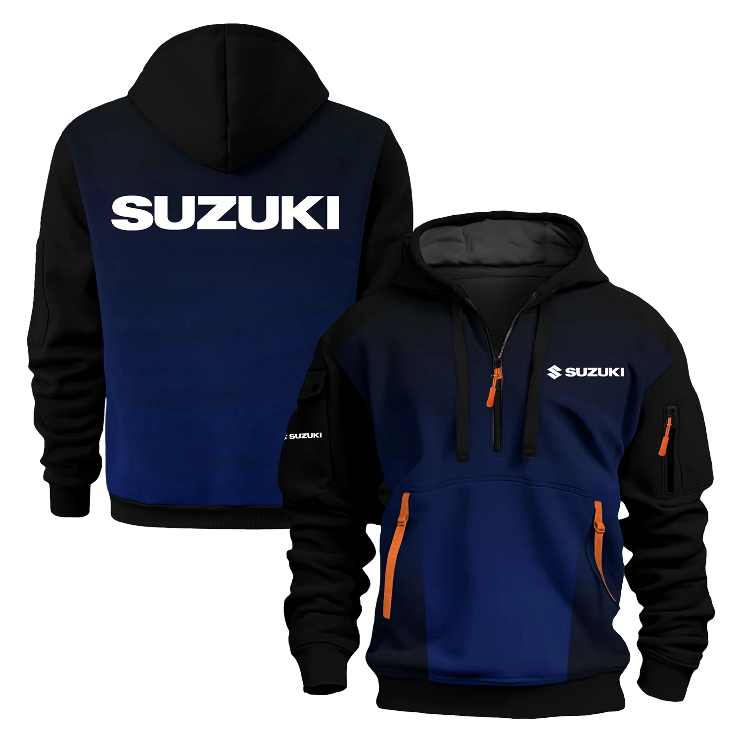 Elevate your wardrobe with our Suzuki hoodie half zipper half zipper, meticulously crafted for both function and fashion. Featuring long sleeves for added warmth and coverage, this hoodie keeps you comfortable in cooler conditions. The hooded neckline adds a modern, trendy touch to the ensemble, making it a perfect choice for those who appreciate a contemporary look.