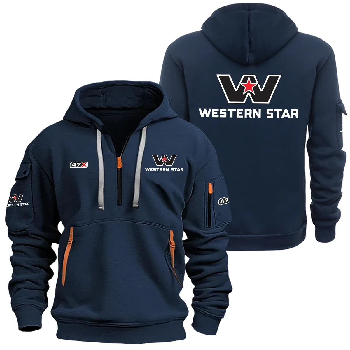 Elevate your wardrobe with our Western Star 47X hoodie half zipper half zipper, meticulously crafted for both function and fashion. Featuring long sleeves for added warmth and coverage, this hoodie keeps you comfortable in cooler conditions. The hooded neckline adds a modern, trendy touch to the ensemble, making it a perfect choice for those who appreciate a contemporary look.